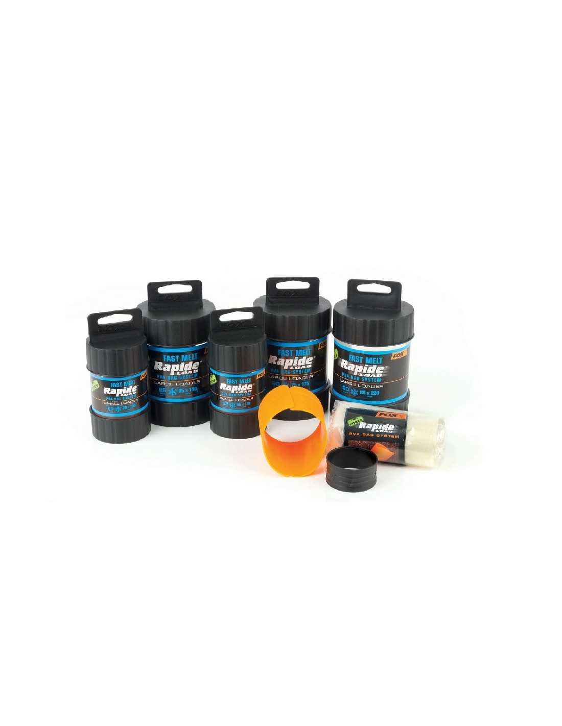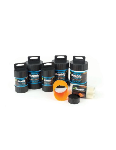 El sistema incluye una herramienta de carga naranja, un collar de bloqueo negro y un total de 25 bolsas de PVA de fusión rápida (20 para los tamaños de 75 mm x 175 mm y 85 mm x 220 mm). Todo se presenta en un práctico tubo de plástico moldeado que mantiene los componentes secos y organizados.